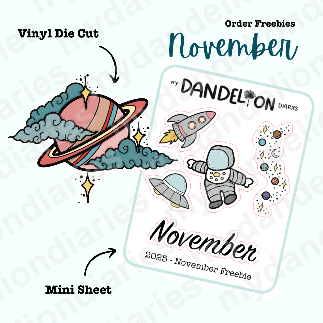 Mini sheet includes a space theme with an astronaut, space ship, and rocket. There is also the monthly script sticker, and a 1.3 inch space sticker. The vinyl die cut is my take on what Saturn would look like if it was in a "Retro" color. Both items come with any order!