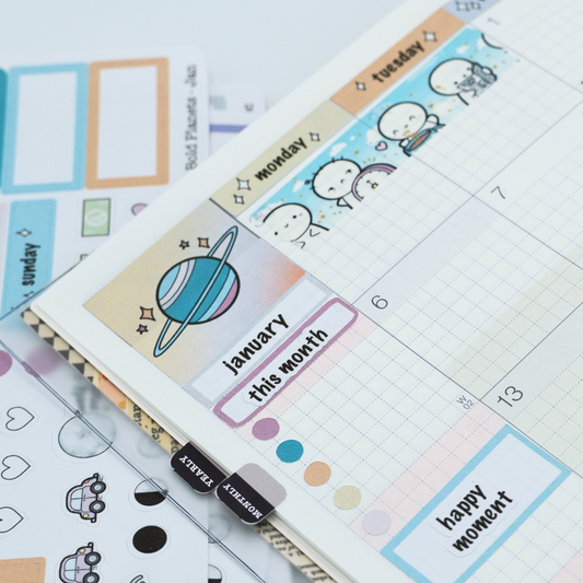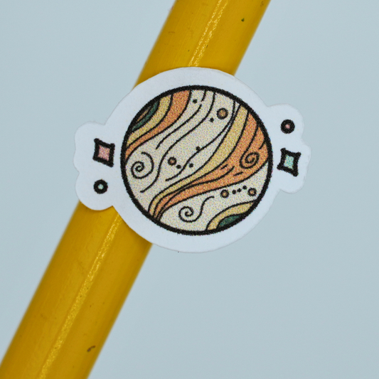Mini sheet includes a space theme with an astronaut, space ship, and rocket. There is also the monthly script sticker, and a 1.3 inch space sticker. The vinyl die cut is my take on what Saturn would look like if it was in a "Retro" color. Both items come with any order!