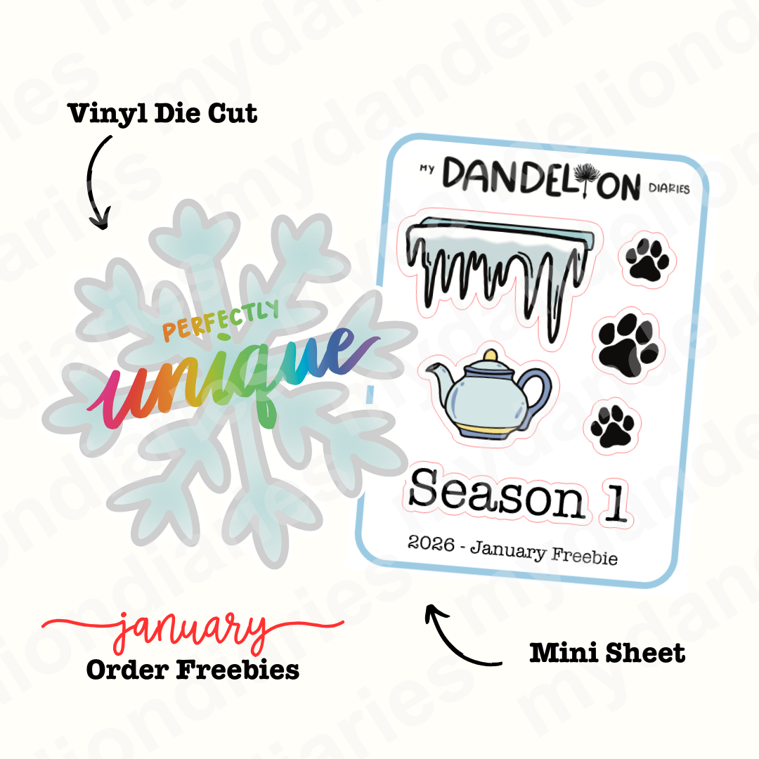 Mini sheet includes a 1.3" icicle doodle, paw prints, and a tea pot. The vinyl die cut is a snowflake with "Perfectly Unique" written across it. Both items come with any order!